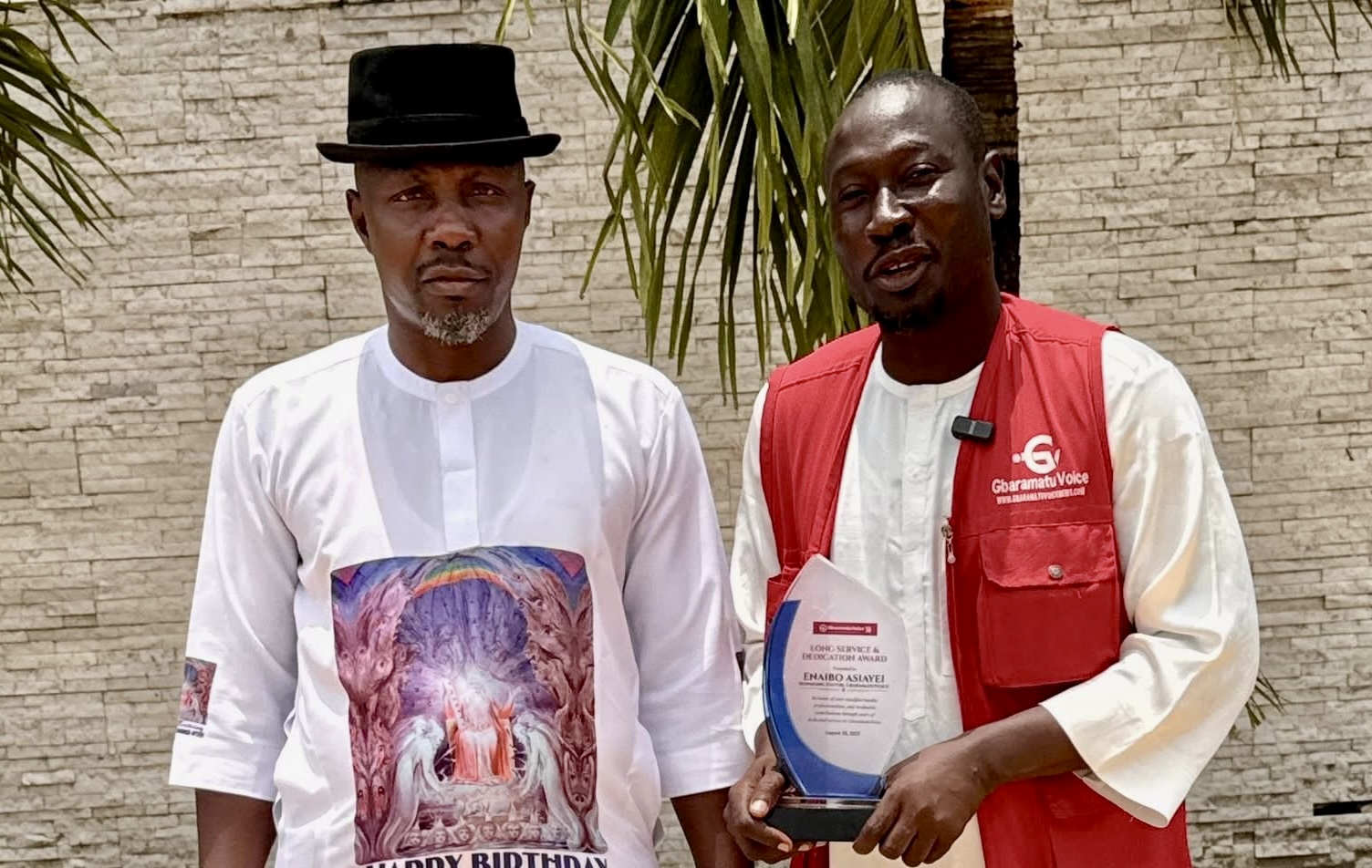This my ten years dedication award of meritorious and long service in telling the Niger Delta stories through the Gbaramatuvoice, I dedicate to our leader, who stood firm for our people under the rain and sun, blackmail, seen and unseen bullets. Yes, in that regard Gbaramatuvoice was formed by Mr Jacob Abai to tell the true story of our region and Tompolo who was labelled with all sorts of derogatory names has changed. The narrative that he stood for the development of our region, he is the Mandela of the Niger Delta region, he is a man whose vision is like a compass to our growth and today, this story is a story of my journey. Yes Asiayei Enaibo who hails from Bobougbene, Ayakoromo Obotebe communities dedicated this award to our father, High Chief Government Oweizide Ekpemupolo for peace, freedom, development and environmental justice.