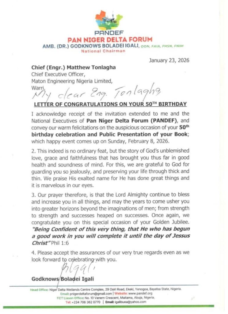 I acknowledge receipt of the invitation extended to me and the National Executives of Pan Niger Delta Forum (PANDEF), and convey our warm felicitations on the auspicious occasion of your 50th birthday celebration and Public Presentation of your Book; which happy event comes up on Sunday, February 8, 2026.