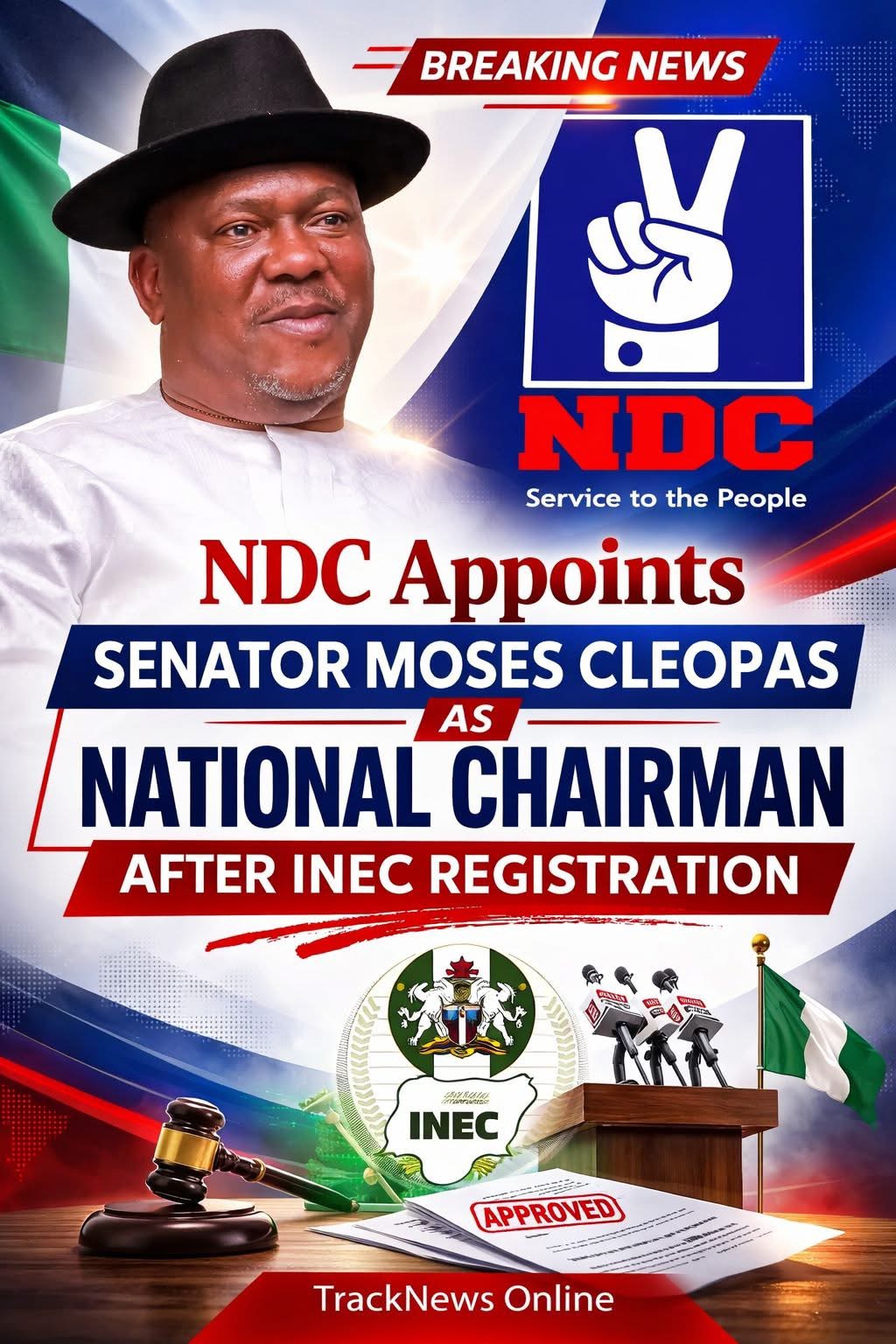 The Nigeria Democratic Congress (NDC) has appointed Senator Moses Cleopas as its National Chairman following the party’s official registration by the Independent National Electoral Commission (INEC). The development marks the formal entry of the NDC into Nigeria’s political landscape ahead of the 2027 general elections. The announcement was reported by Track News Online.